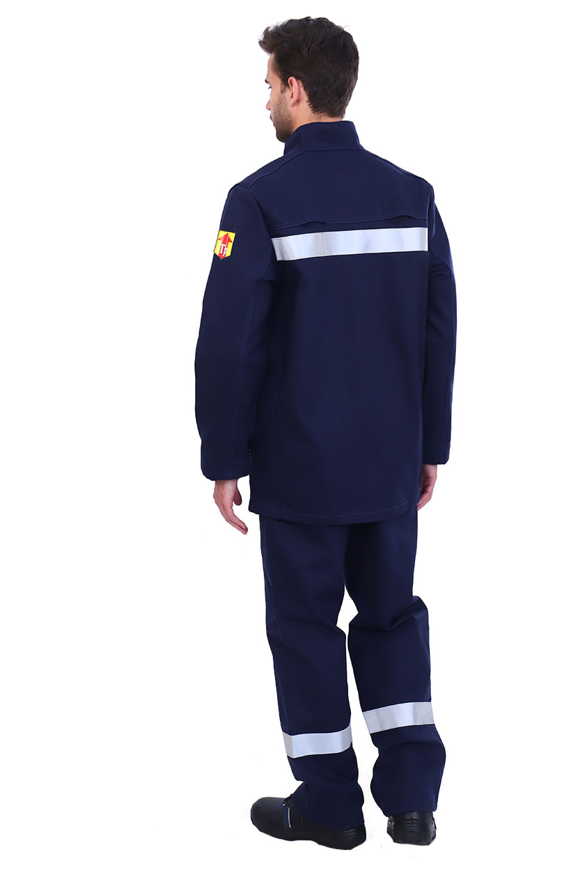 Спинка с настрочной кокеткой (кокетка двойная: из верха и из бязи). При настрачивании кокетки обрабатываются два вентиляционных отверстия. Срез кокетки обтачивается кокеткой из бязи. Огнестойкий СОП 5 см по кокетке. Рукава втачные одношовные, с усилительными накладками: центральная часть, передняя и локтевая накладка. Срезы локтевой и передней накладок заходят под центральную накладку. На средней части левого рукава знак защиты Тр.